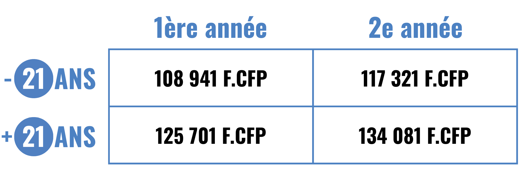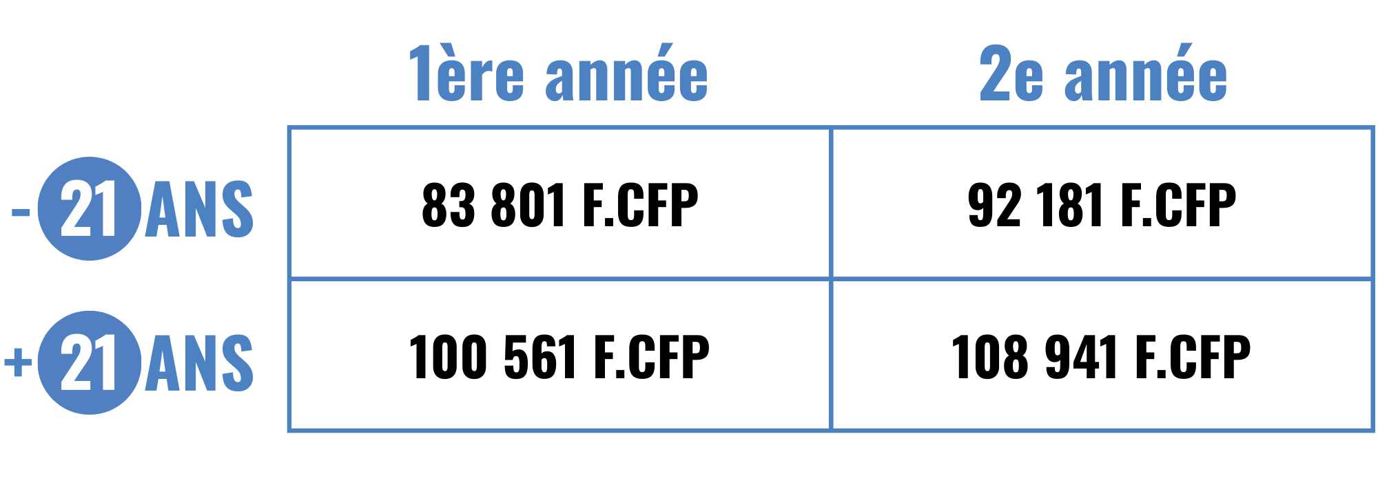 Le salaire de l’alternant est calculé sur la base du SMG (Salaire Minimum Garanti : 167 602 F.CFP), en fonction de son âge, du niveau du diplôme préparé ainsi que son ancienneté. Cette rémunération ne peut être inférieure à 50% du SMG.