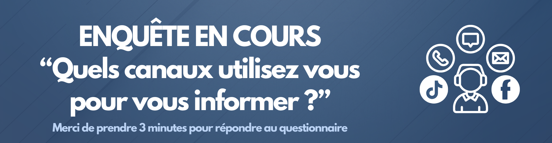 Aujourd’hui, nous lançons une enquête rapide (3 minutes) sur l’utilisation des différents canaux d’information : site internet, réseaux sociaux, bouche-à-oreille, affichage, SMS, e-mail, événements, etc.